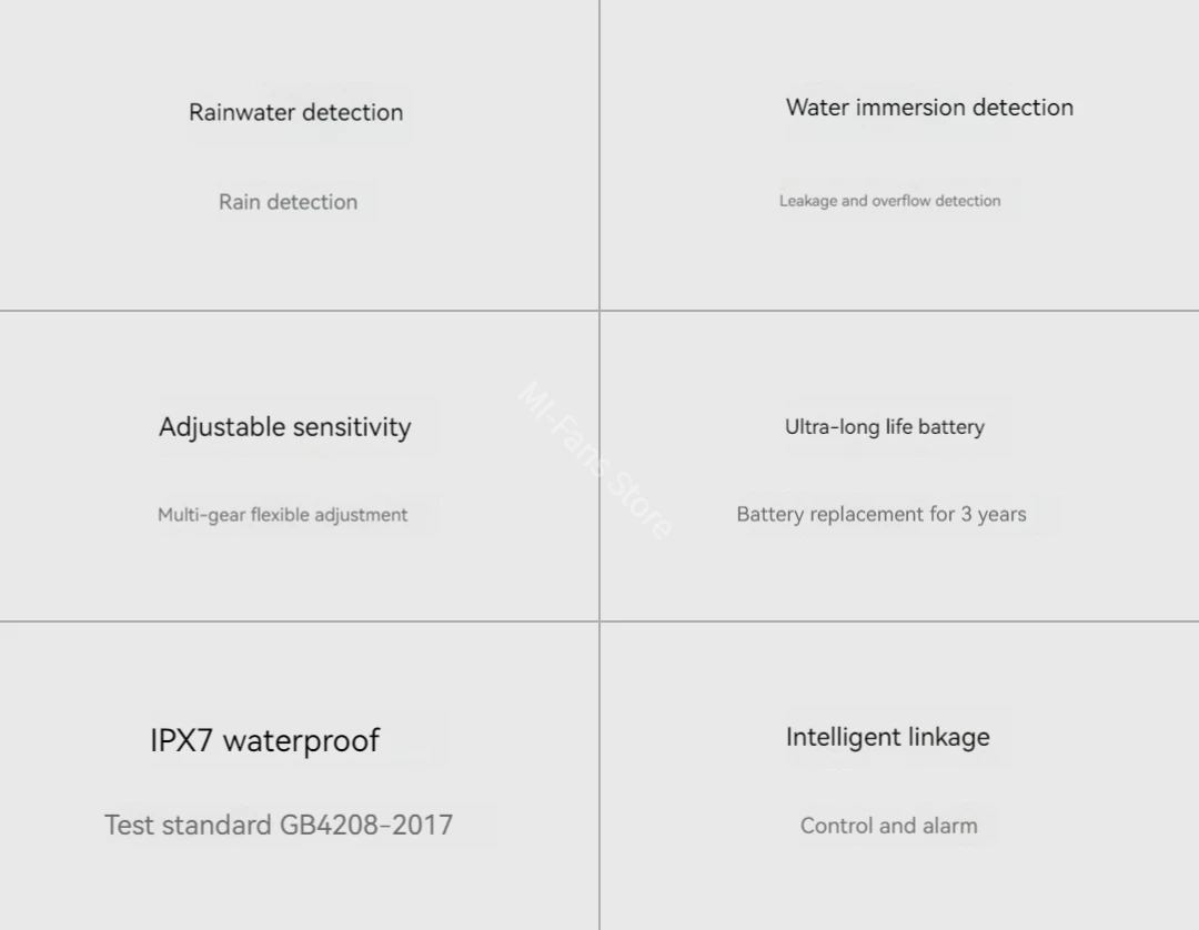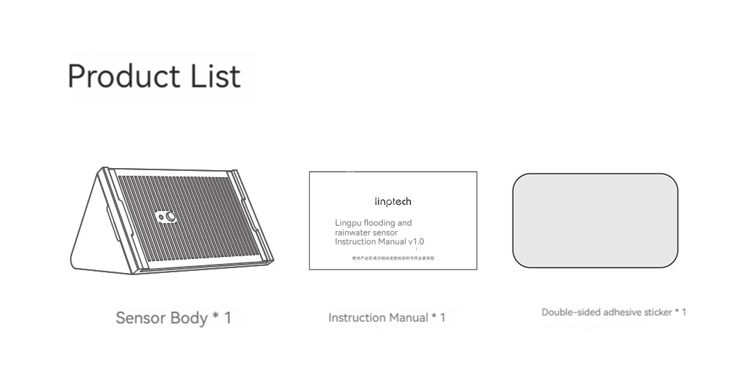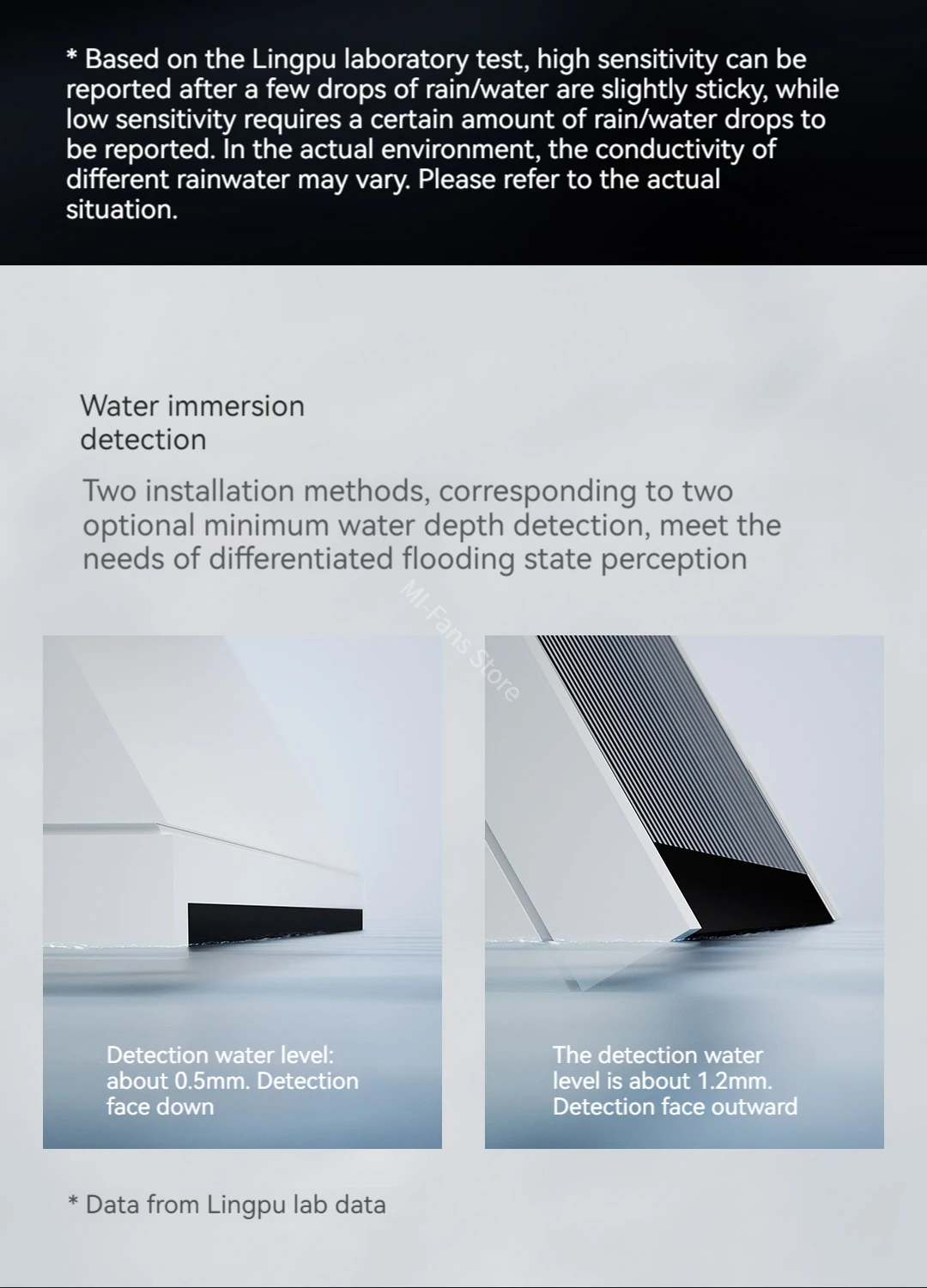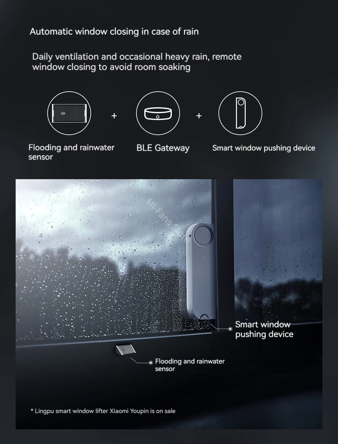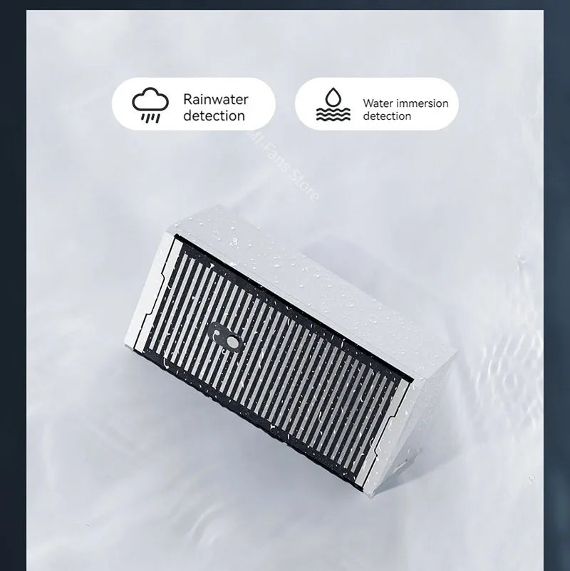 Rainwater Sensor: Placed on the inside of a window and Please disable the security message strong alert function in the app(Mijia APP--Me--Setting--Notification Setting--Device Notification Setting--Linptech Rain Sensor RS1--Security Strong Alert Setting--Disable, the Side of Electrode Face Up