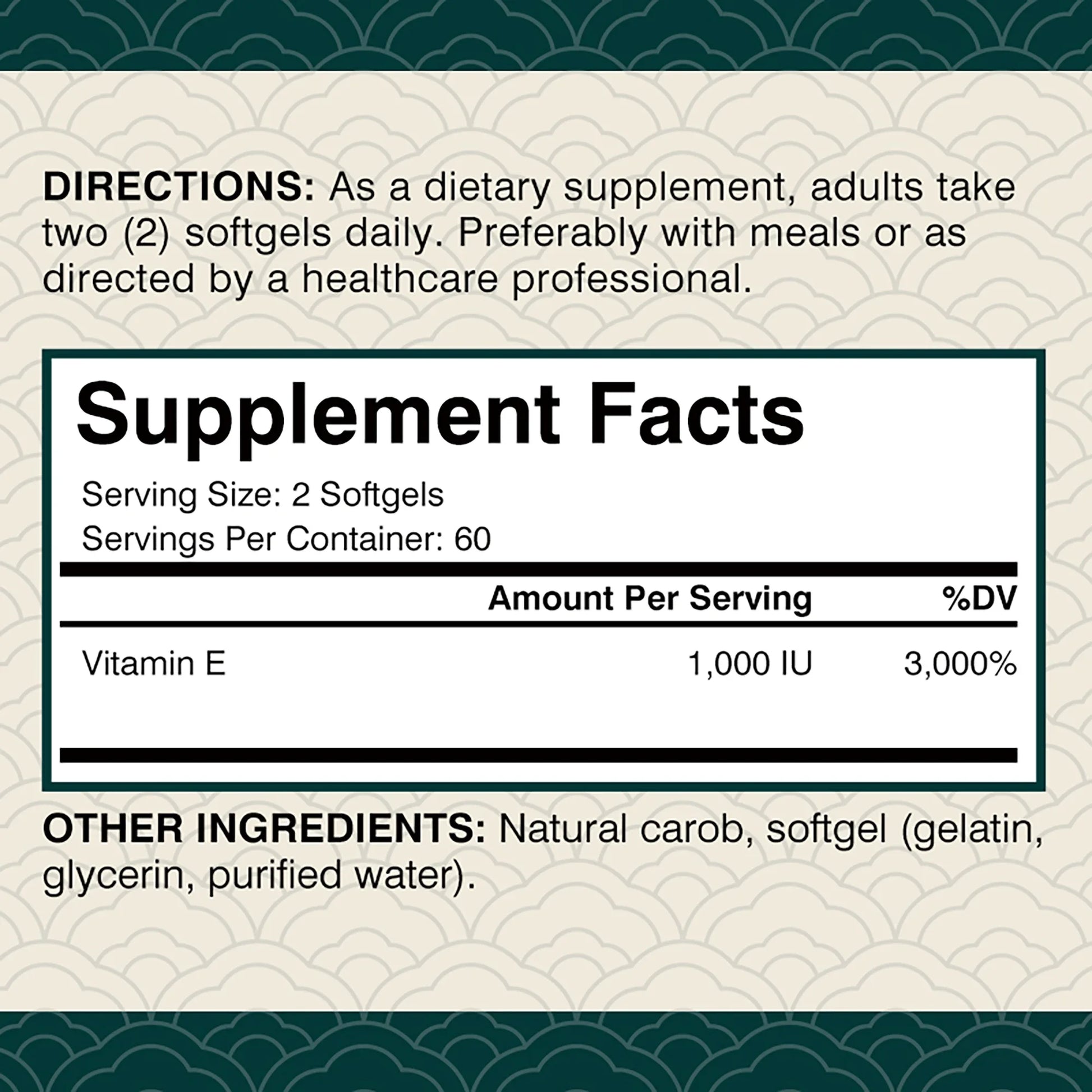 Vitamin E 1000IU Capsules - for Antioxidant, Skin, Cellular Respiration and Cardiovascular Health Support - 120 Capsules